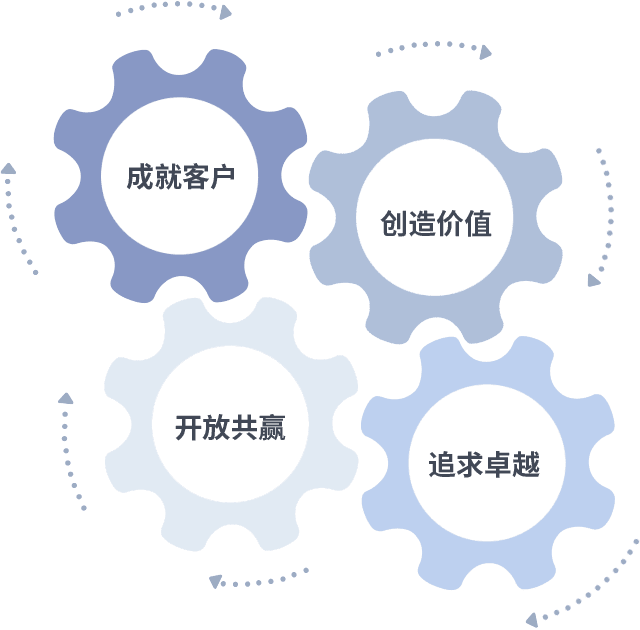 成就客户是一切决策的出发点,,,,创造价值是衡量所有工作的标准,,追求卓越是我们做事做人的态度,,开放共赢是我们的格局也是最终的结果。。价值观的齿轮环环相扣,,推动着组织里的每个人不断向前。。