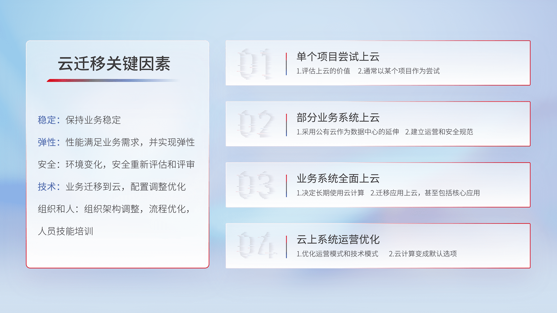 结合实际业务,,,从规划设计、、、云平台选型、、、云原生改造、、、数据迁移、、、、集成交付,,,,迁移全过程为客户识别最佳上云路径,,做好风险识别管理,,,设计网络架构、、、身份权限、、、安全审计合规、、、、操作审计、、日志审计、、、、监控告警策略、、、多站点容灾设计等,,对云上基础设施进行整体规划,,,,提升IT治理水平,,,,以满足弹性、、、高可用、、高性能的需求。。。